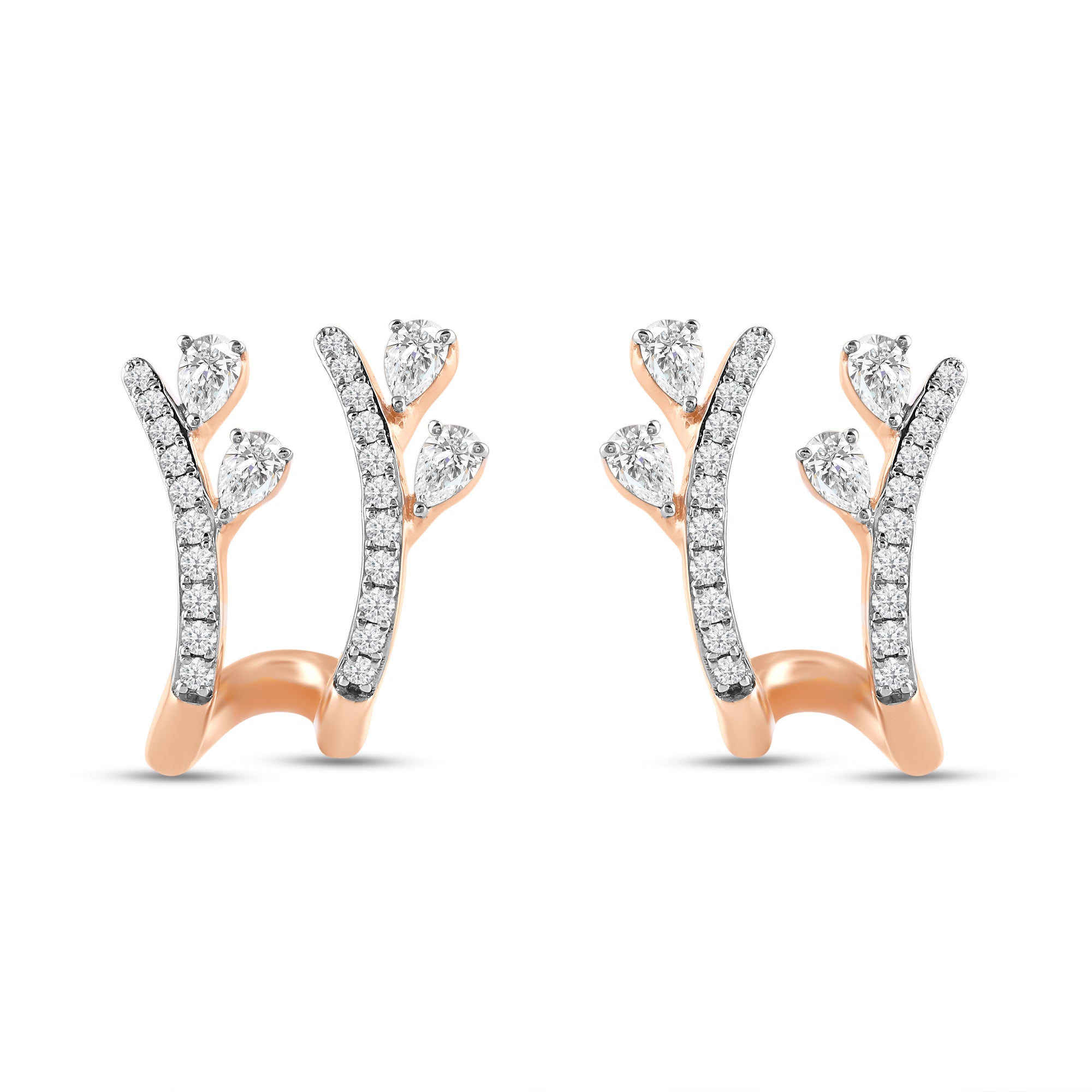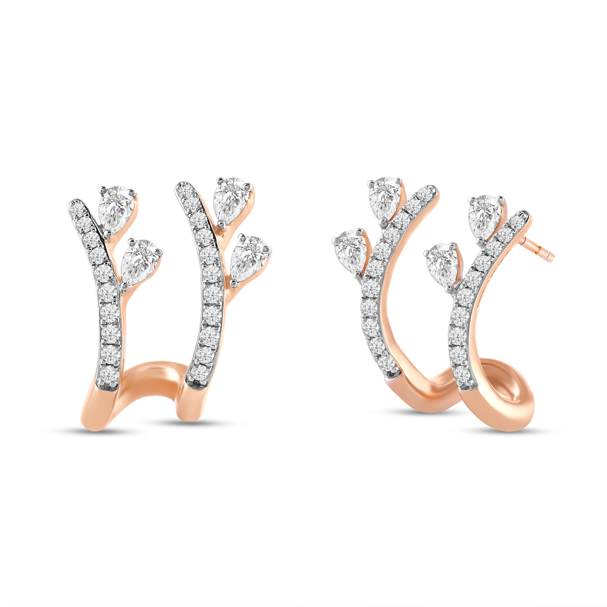 The Annika Leora earrings are crafted in rose gold. Each earring features twin prongs that cradle brilliant pear-shaped diamonds in a poised, architectural embrace. Minimal yet magnetic, this design is a triumph of craftsmanship.