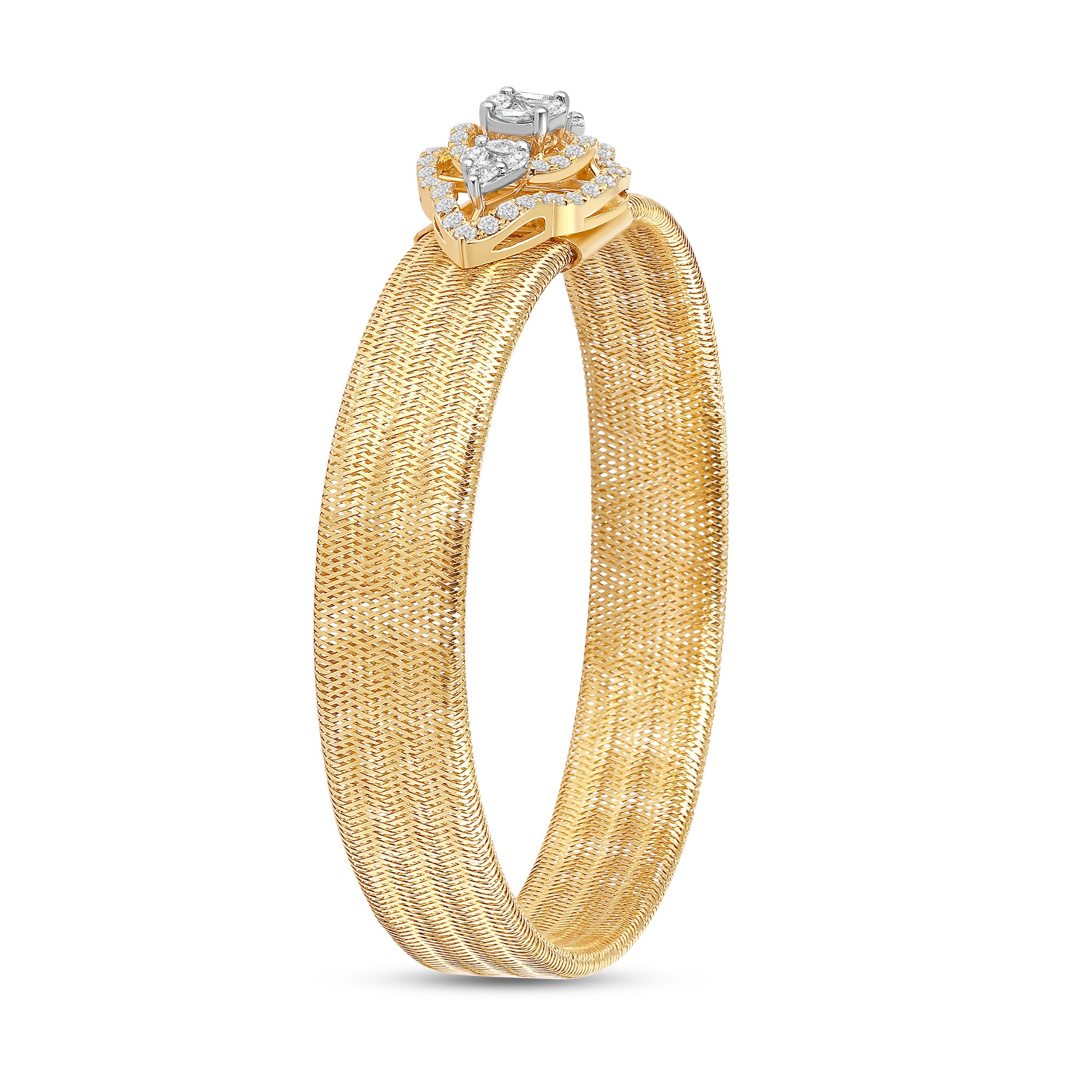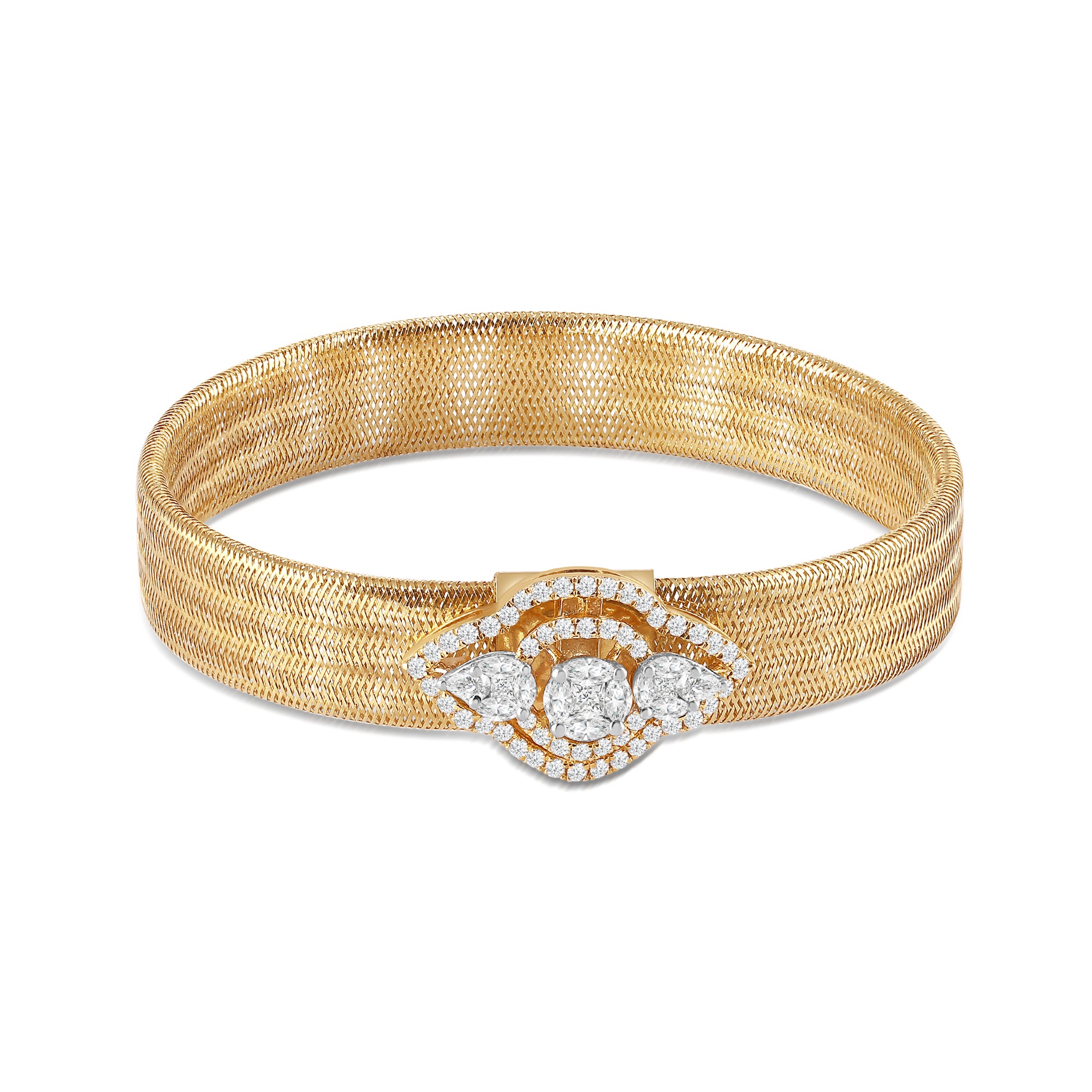 The Aureus Leora Stretchable Bracelet features a wide golden band, luxuriously woven, cradling a blooming cluster of diamonds in a sculpted floral embrace. The soft radiance of gold and the crystalline sparkle of stones unite in a statement of luxury.