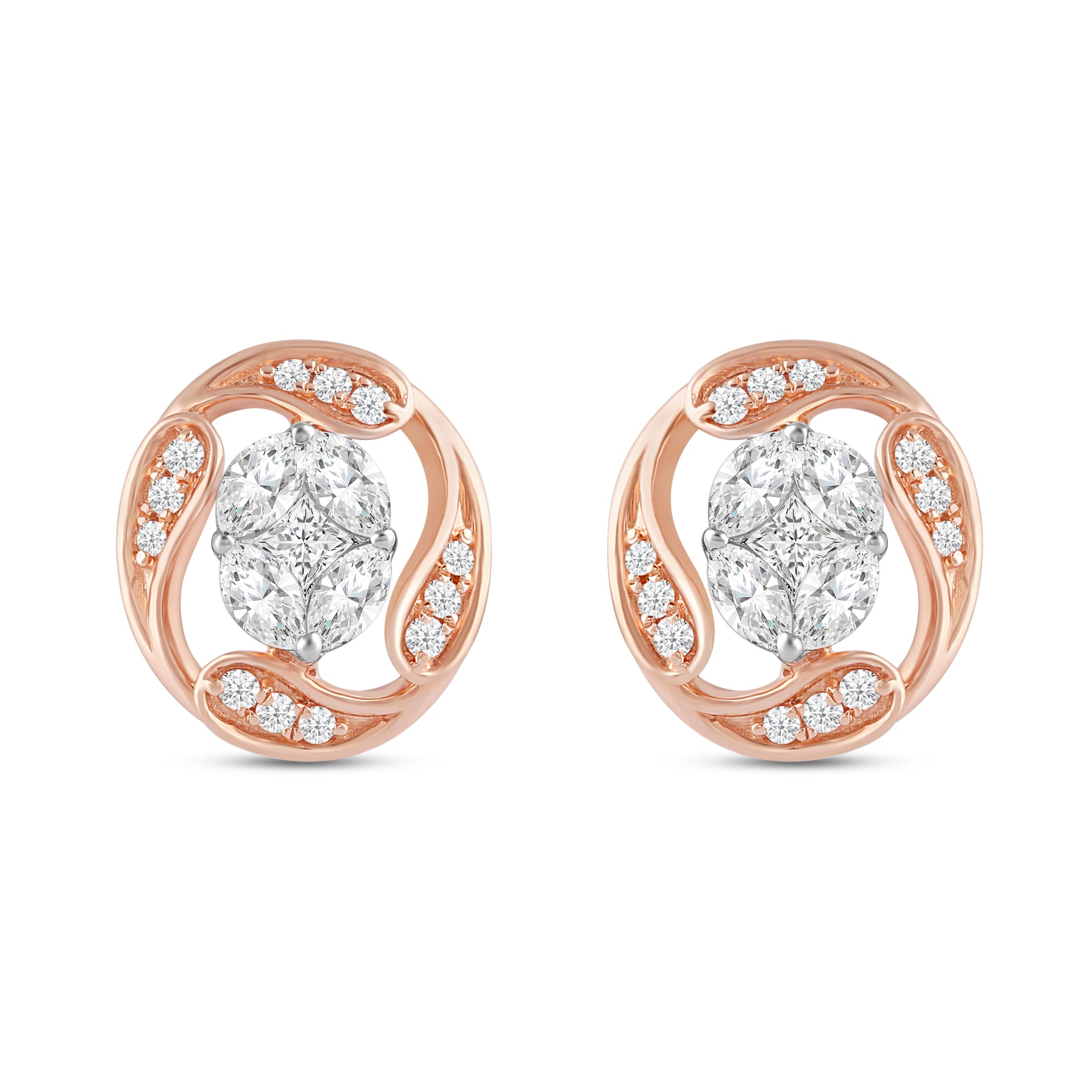 These stunning rose gold studs feature a graceful circular design, where a cluster of diamonds at the centre shimmers like a morning star. Each surrounding curve is delicately traced with pave-set diamonds, mirroring the celestial dance of light across the sky.