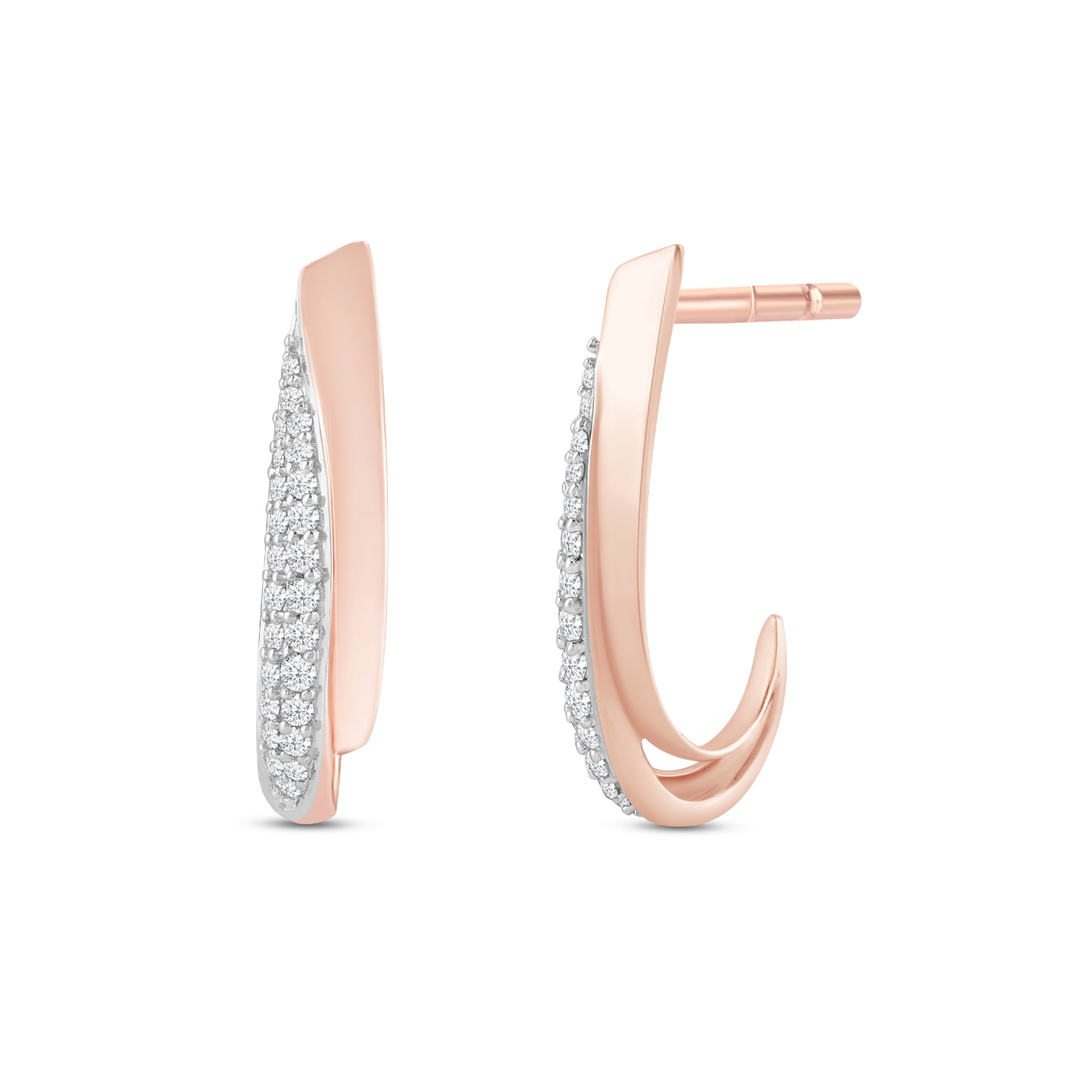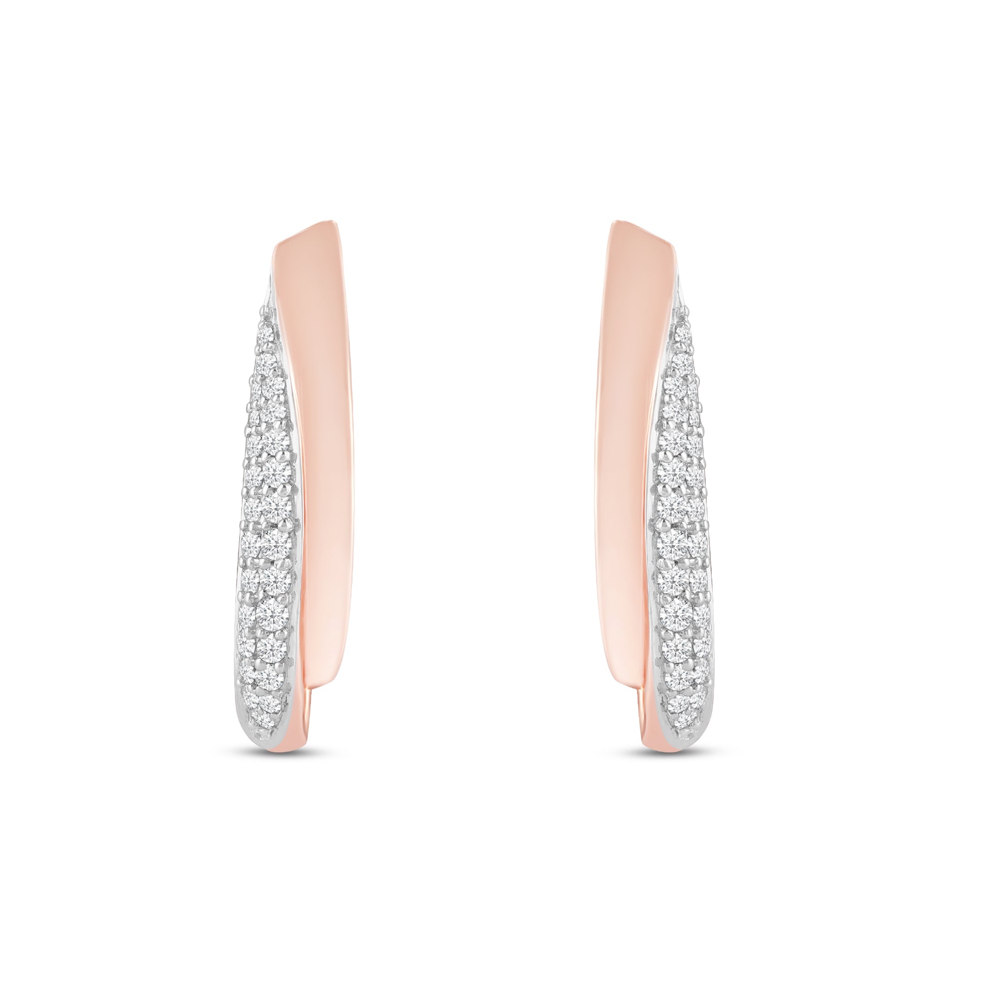 The Castella Leora earrings feature an flawless yet elegant symmetry. Set in rose gold, the curve of each earring features a graceful array of brilliant round-cut diamonds, creating a perfect style statement.