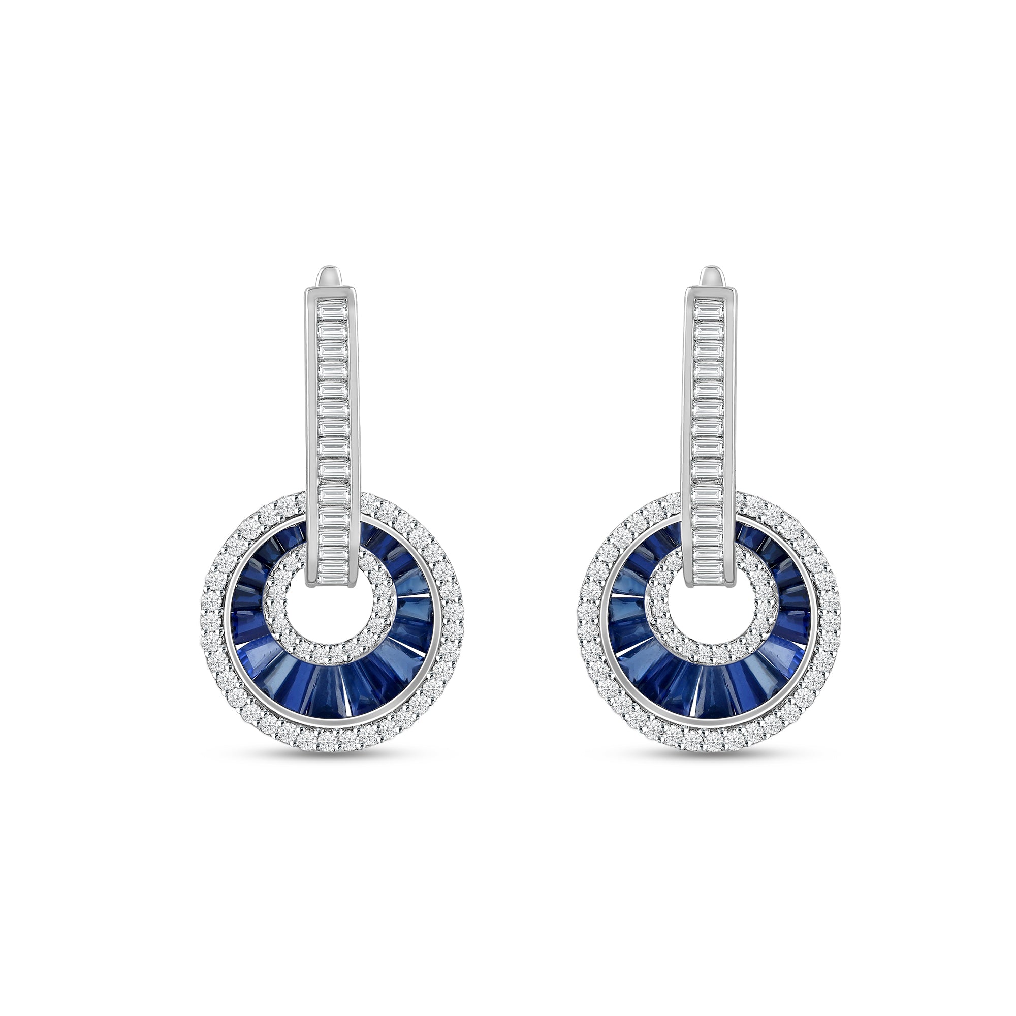 The Celestara Esperia earrings bring together crisp white gold, baguette-cut diamonds, and a bold geometrical design set with sapphires. The sleek, modern silhouette is refined in form and opulent in detail.