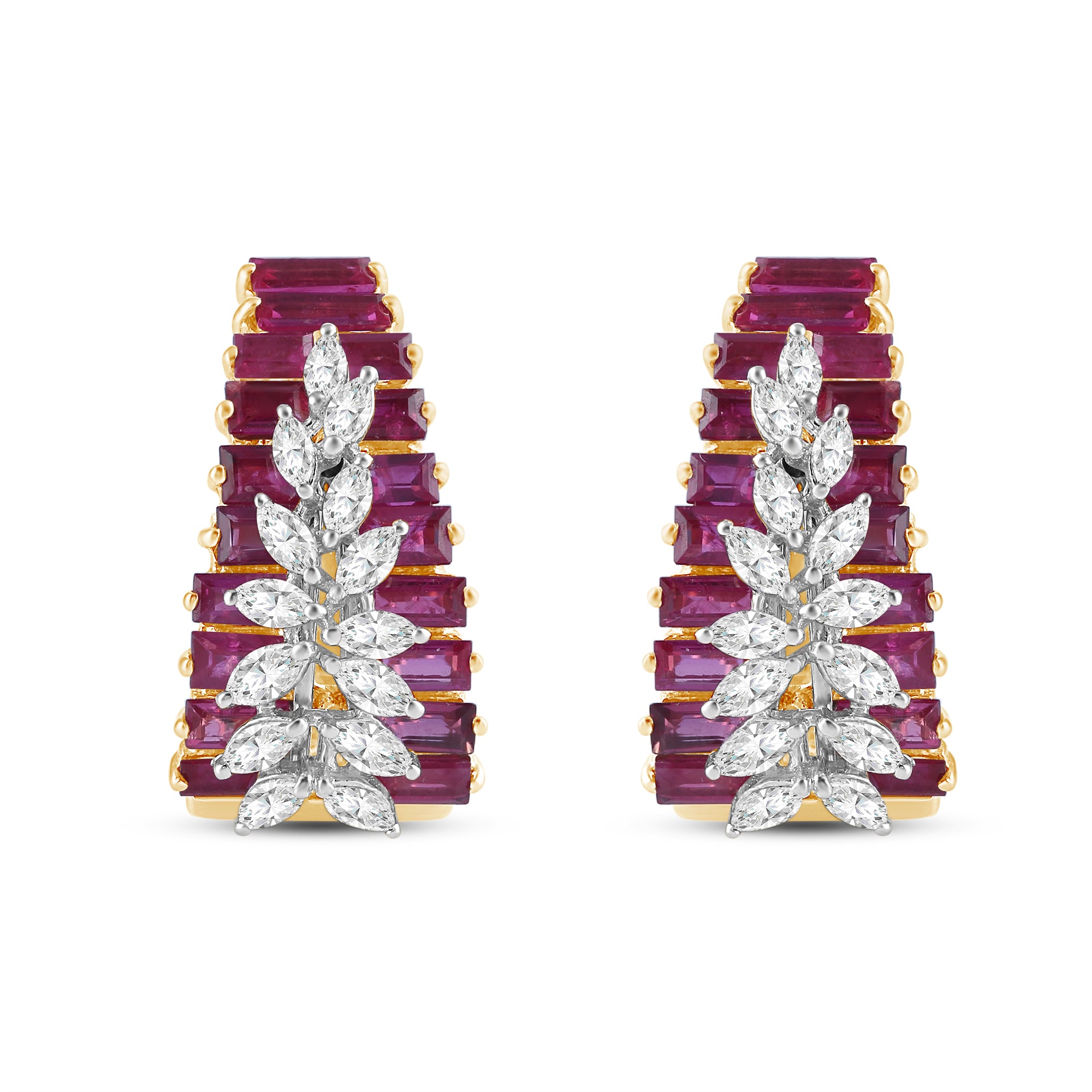 Baguette-set natural rubies, radiant in their deep scarlet hue, form a sleek, continuous arc in these Crimtonia Colour Couture earrings. Gently resting upon this vibrant curve is a delicate leaf silhouette, studded with pear-shaped diamonds and crafted in warm gold.