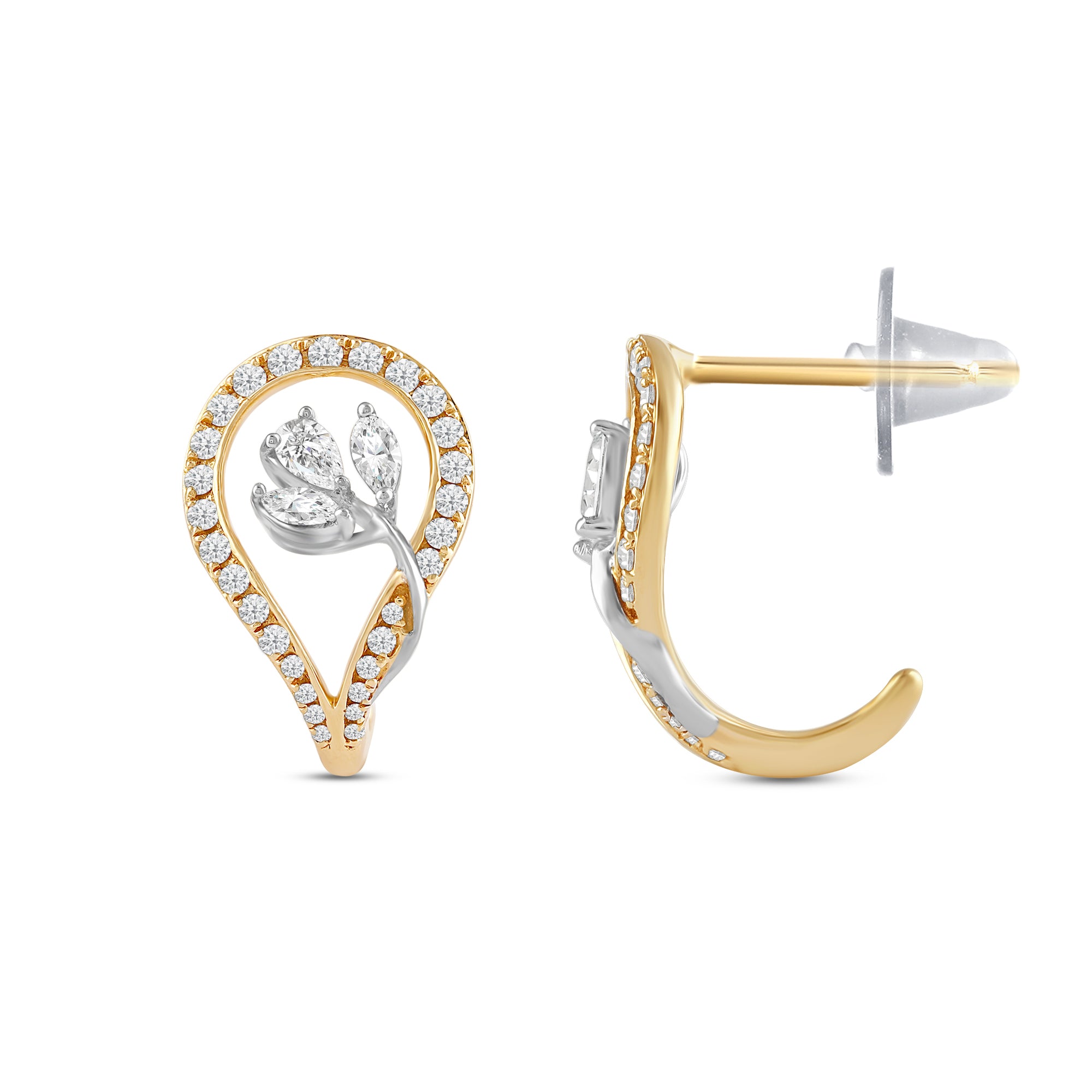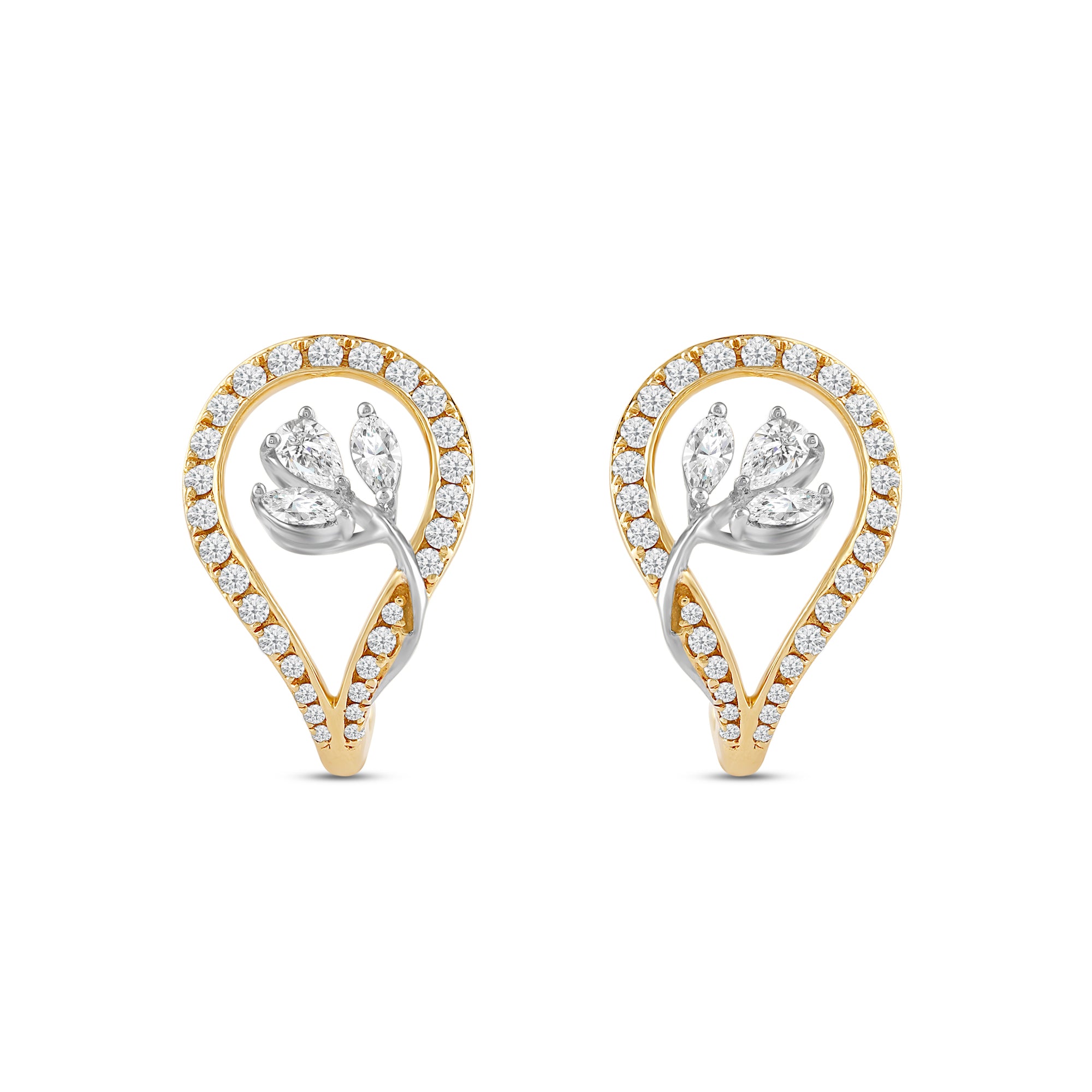 Inspired by the delicate poetry of nature, the Elowen Leora earrings bloom. At the center, leaf-shaped motifs shimmer with diamonds upon an arc of gold, reminiscent of an invereted raindrop.