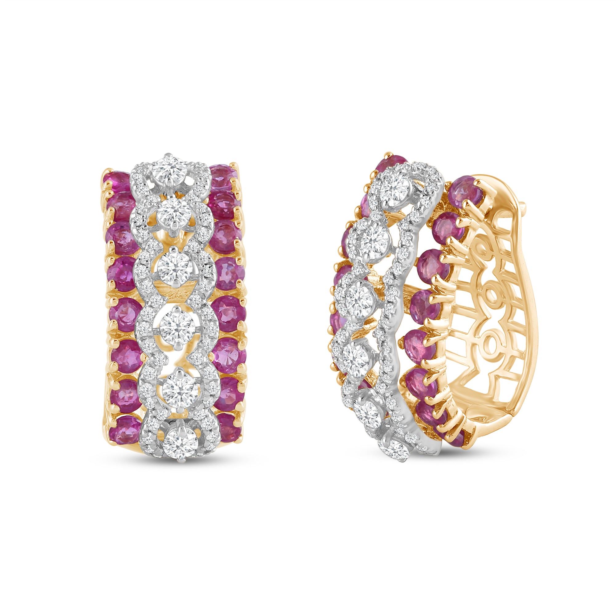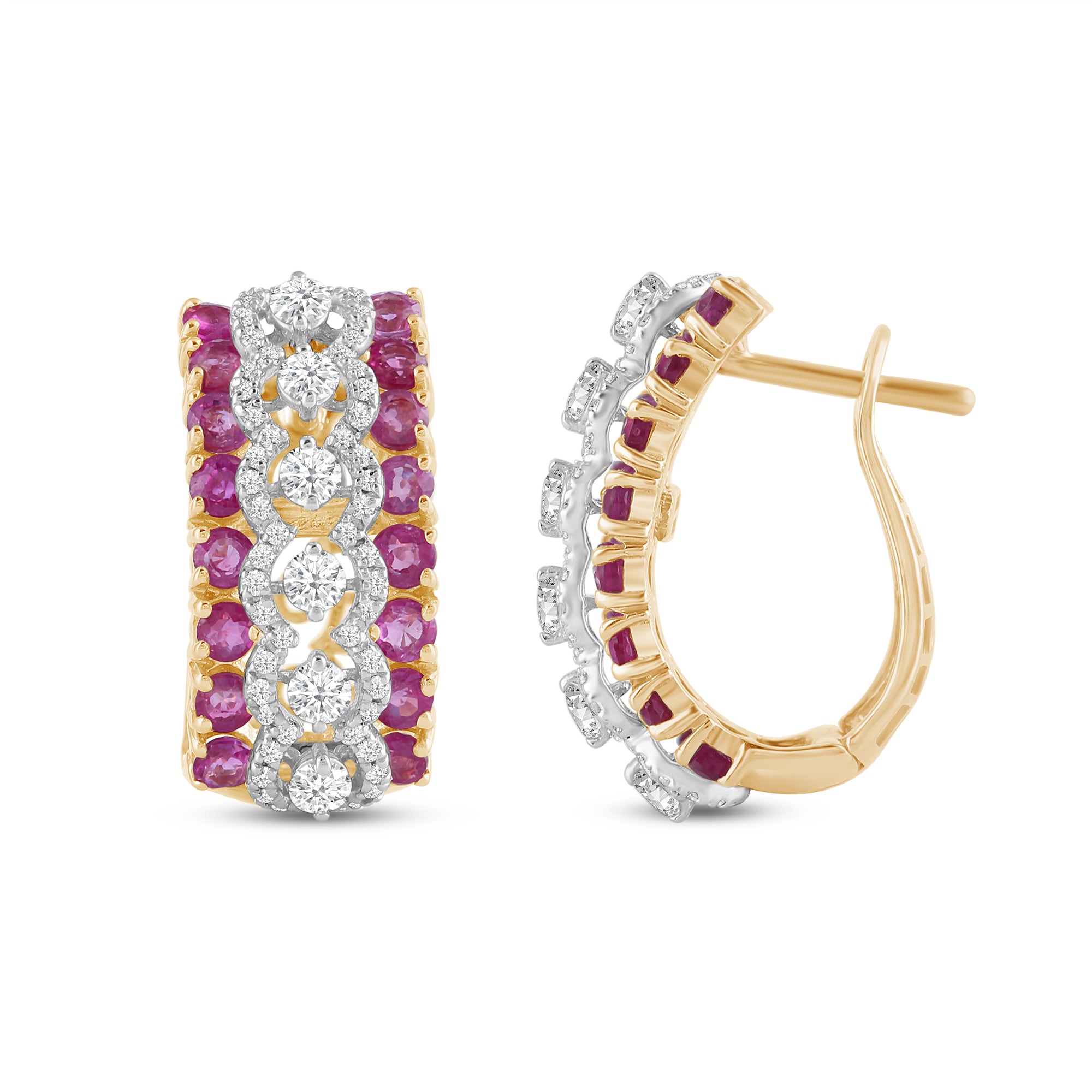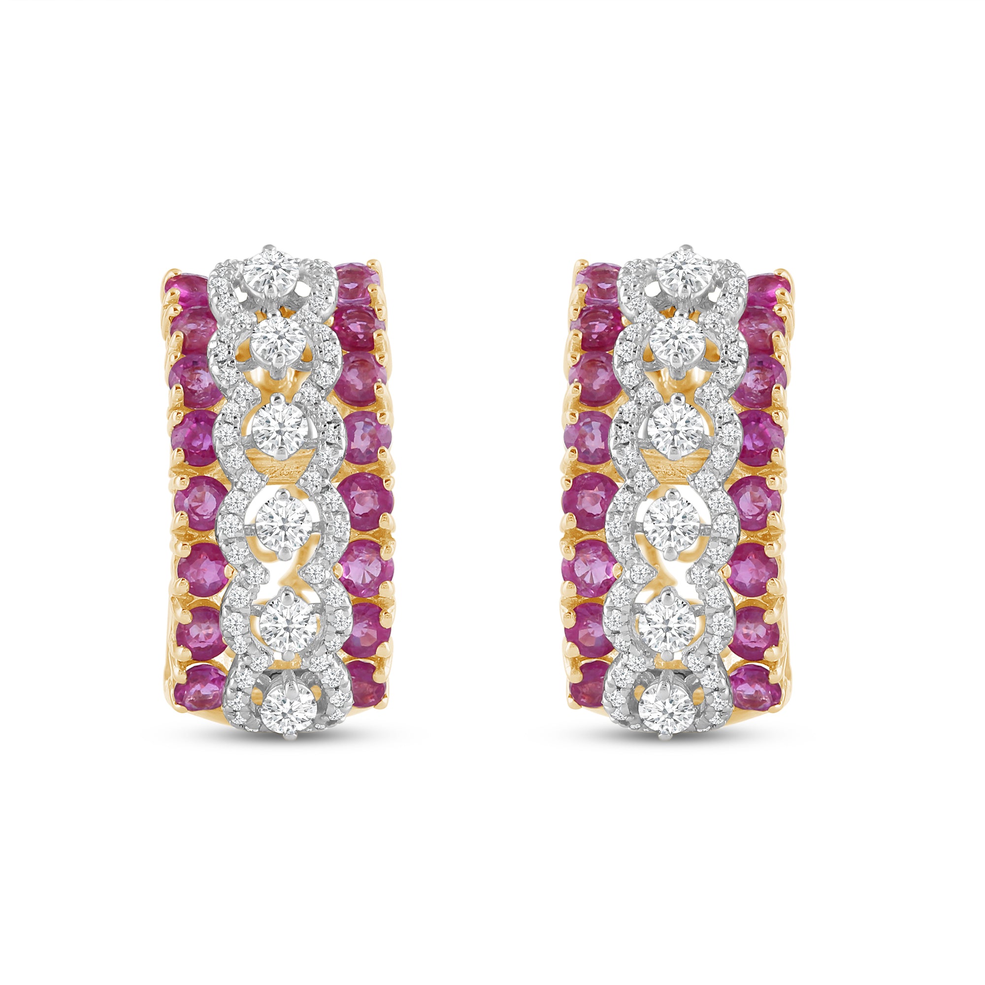 The Flavia Colour Couture Earrings are a cascade of fiery rubies and sparkling round-cut diamonds. Diamonds delicately encircle the hoop silhouette in a contemporary form, crafting a layered and colourful pattern.