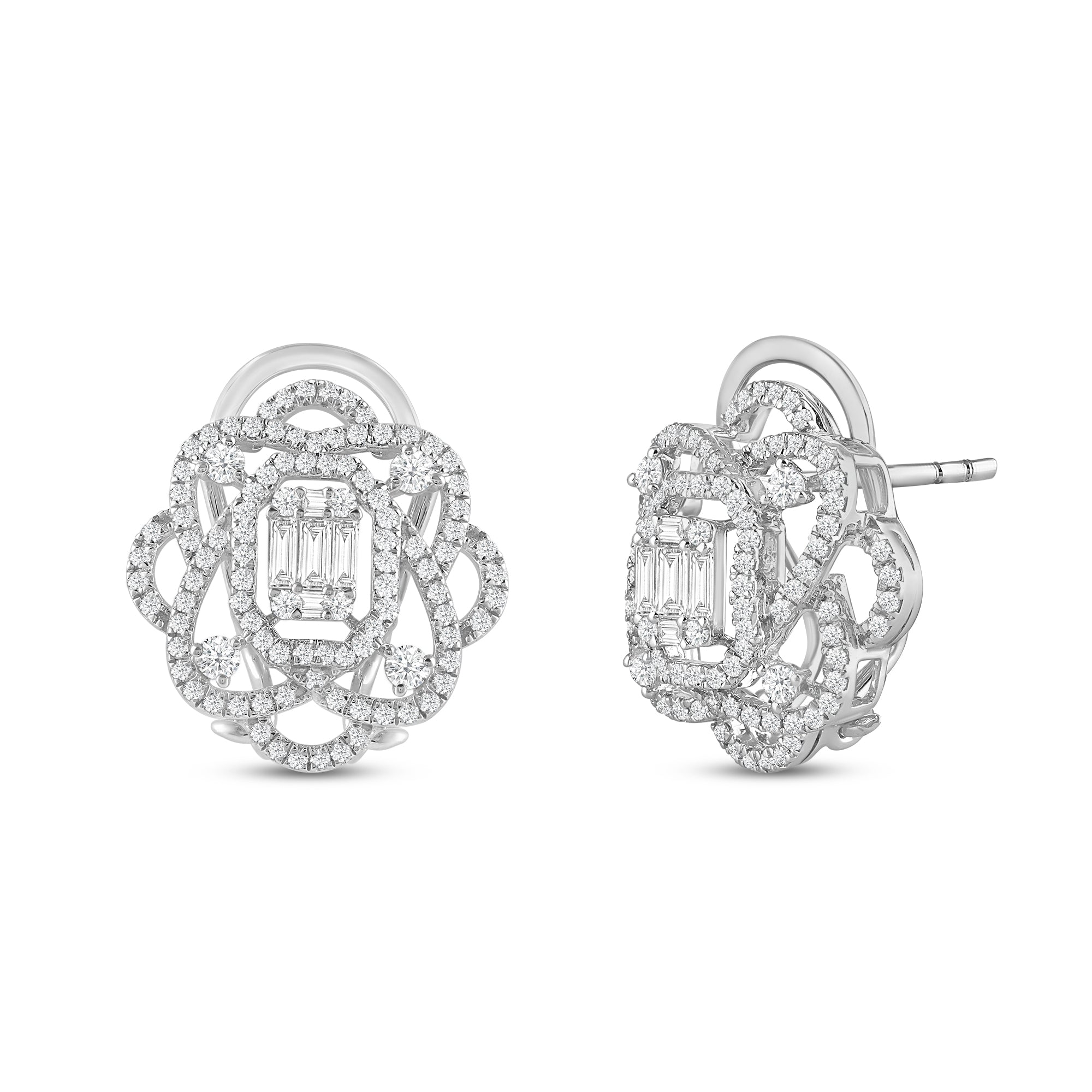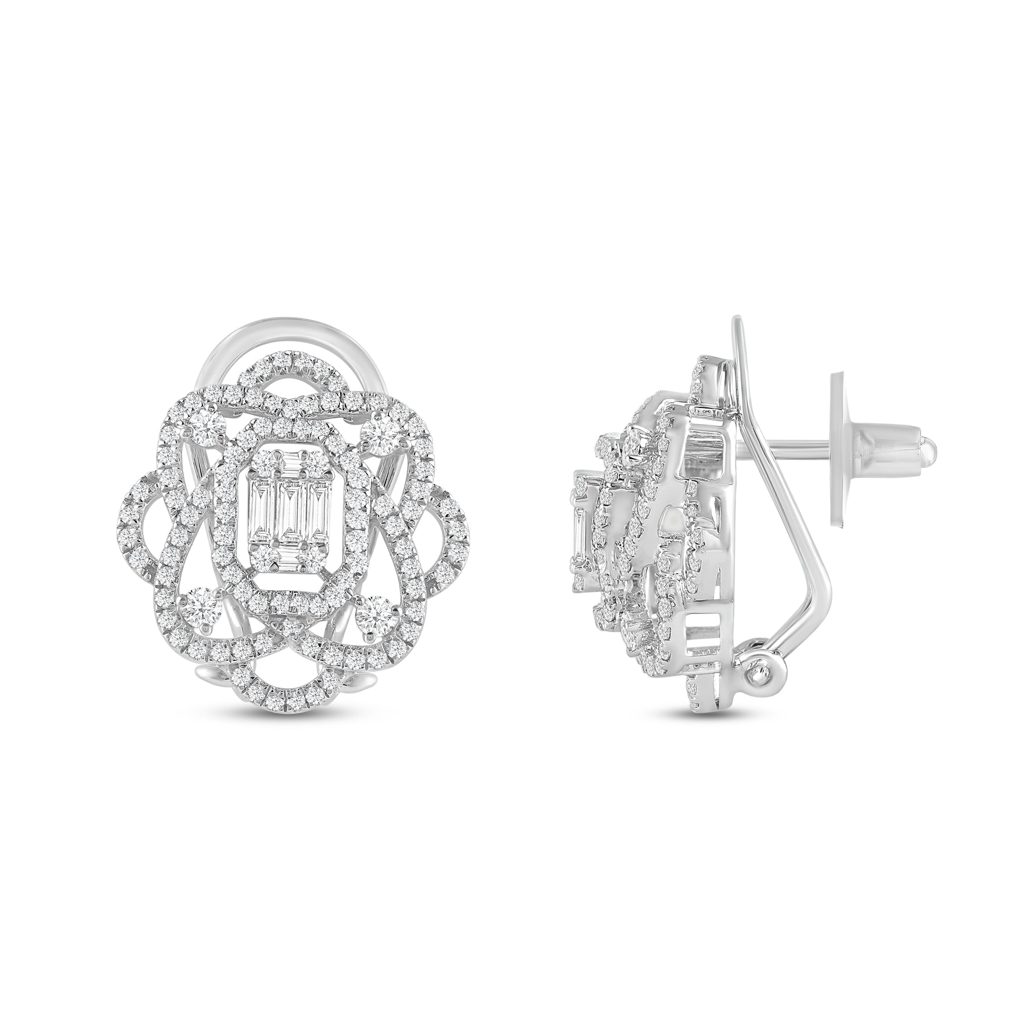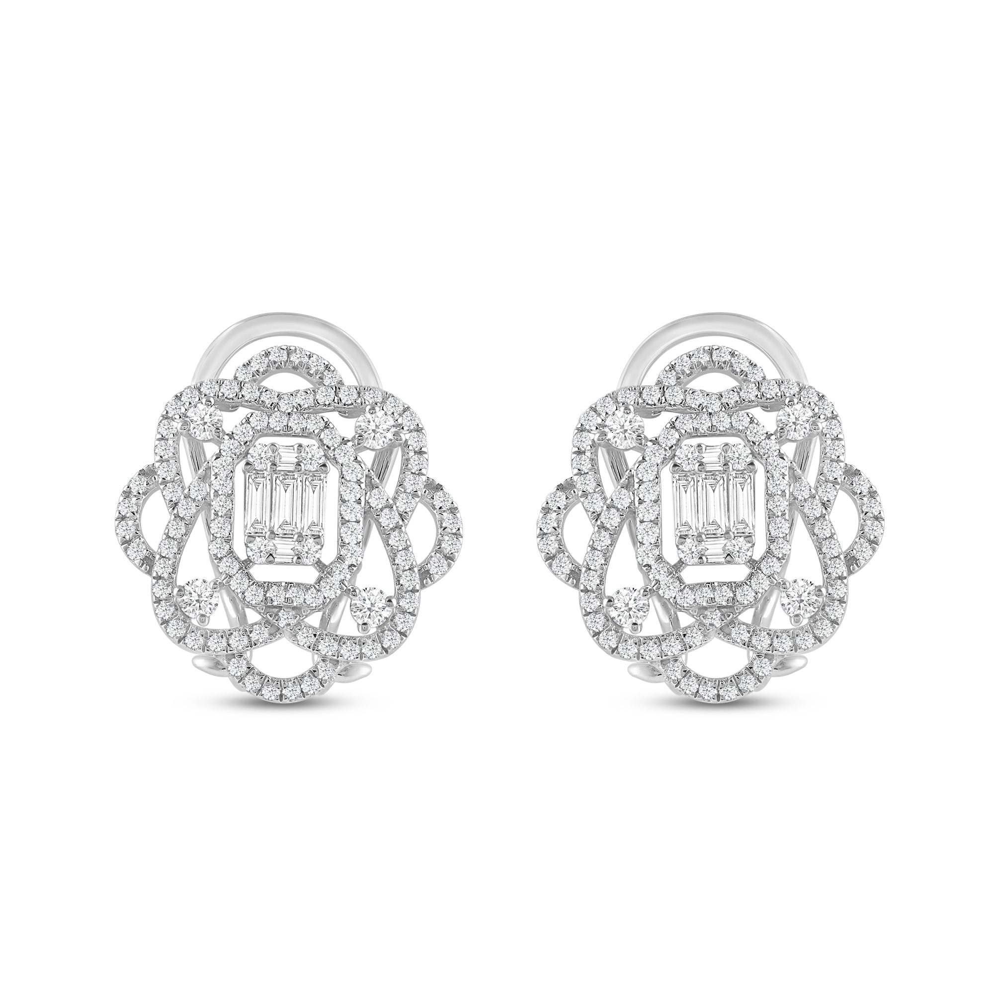Ethereal and endlessly enchanting, the Lilette Leora earrings are a sublime expression of light captured in form. Crafted in radiant white gold, their delicate floral lattice cradles a striking arrangement of baguette-cut diamonds at the center, surrounded by a halo of brilliant pavé and round-cut diamonds.
