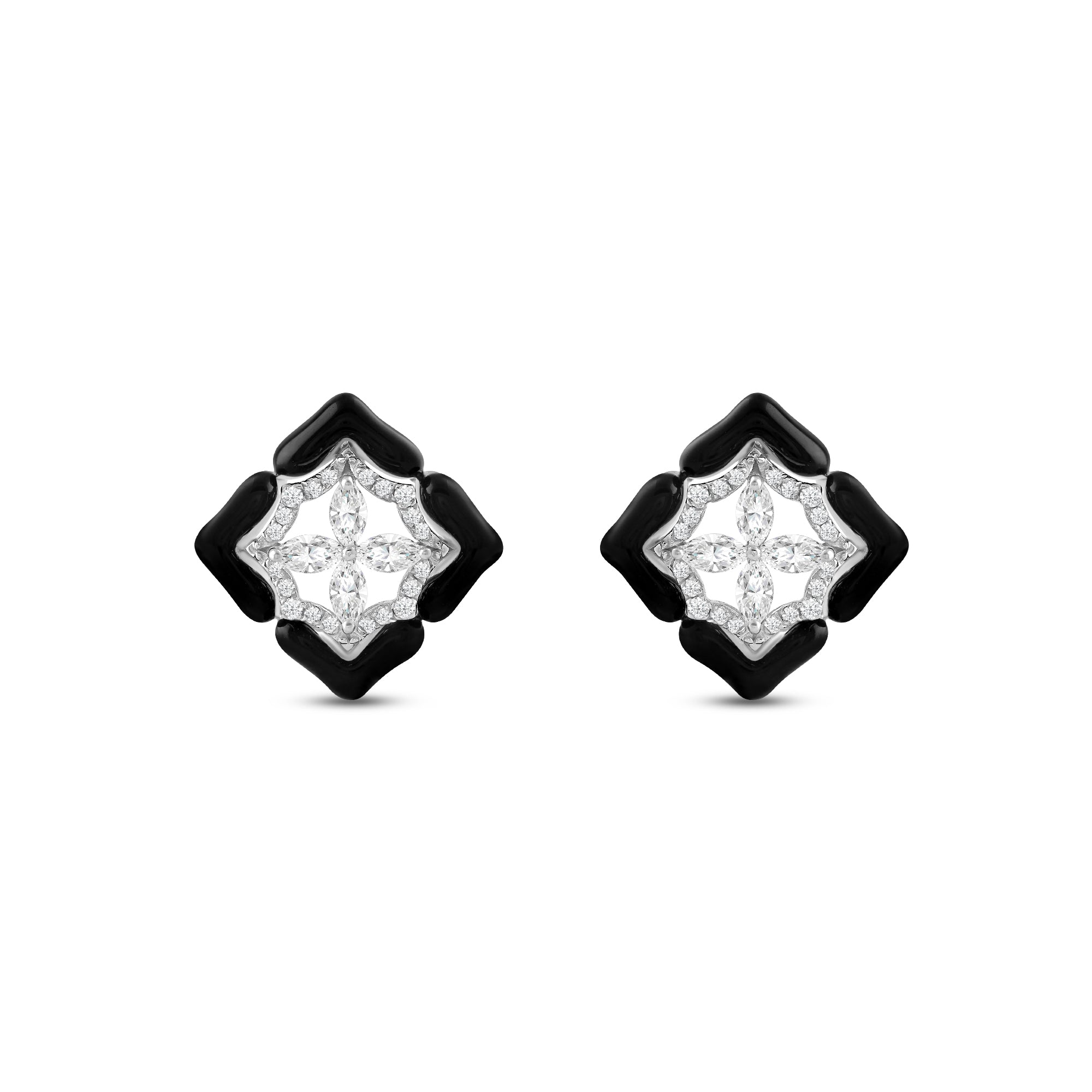 The Midnight Clover Earrings features petal-shaped diamonds that create a symmetry of sparkle, while the dark enamel outlines them with sculptural clarity—bringing attention to the purity of the form and the contrast that defines it.