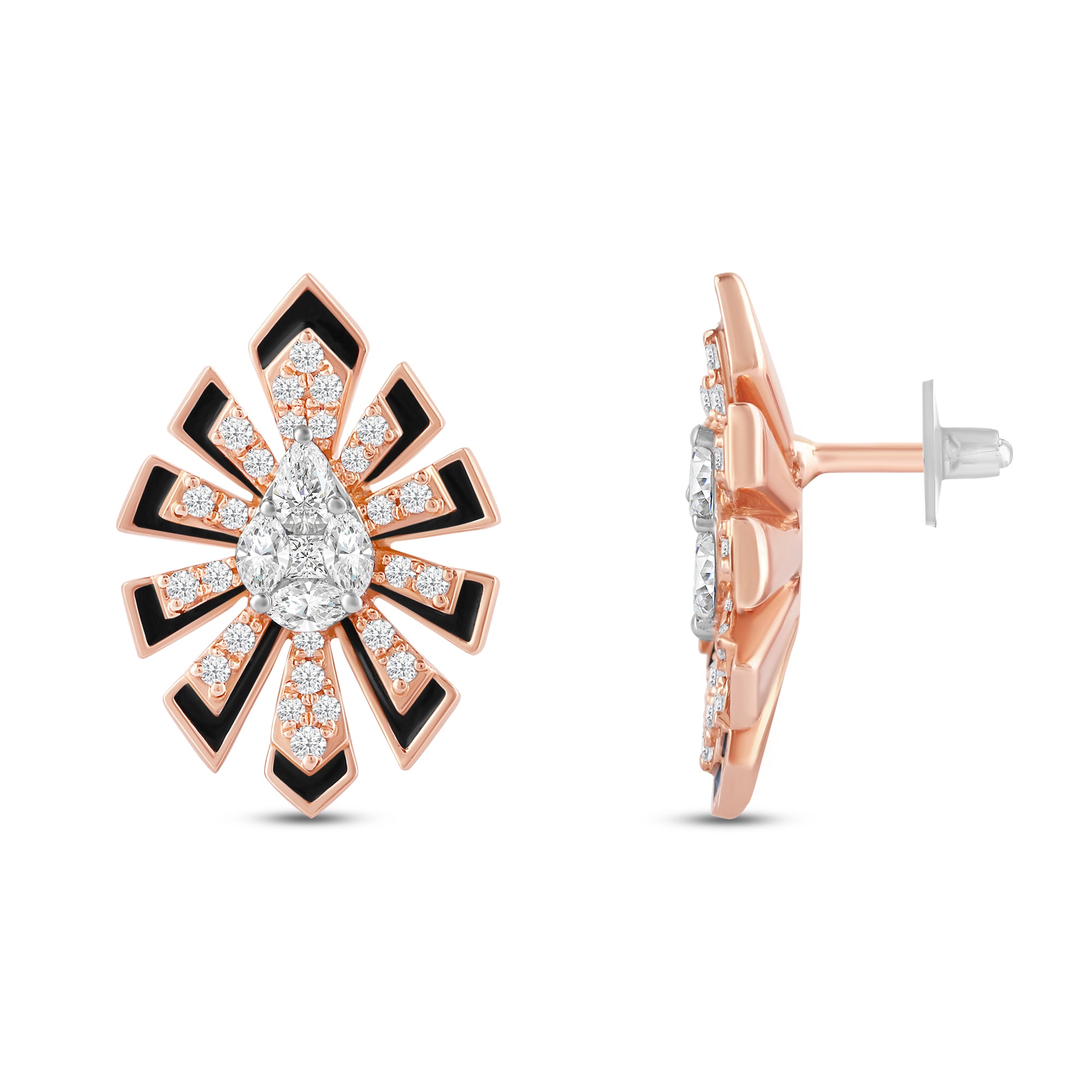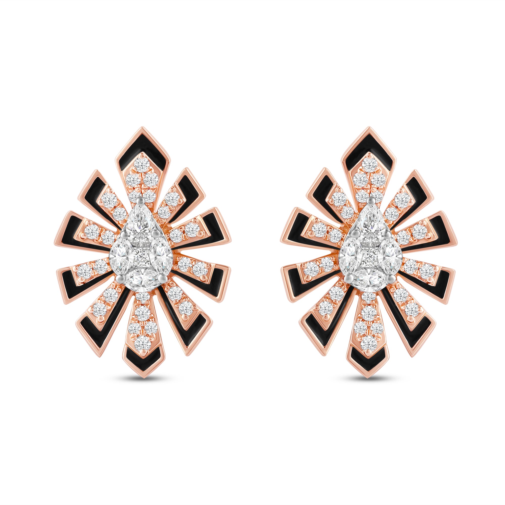At the heart of the Plume Royale earrings rest resplendent diamonds in a pear silhouette. Fanned delicately around it are architectural rose-gold plumes of precision-cut diamonds crowned by black enamel, arranged in geometric harmony that evokes majesty.
