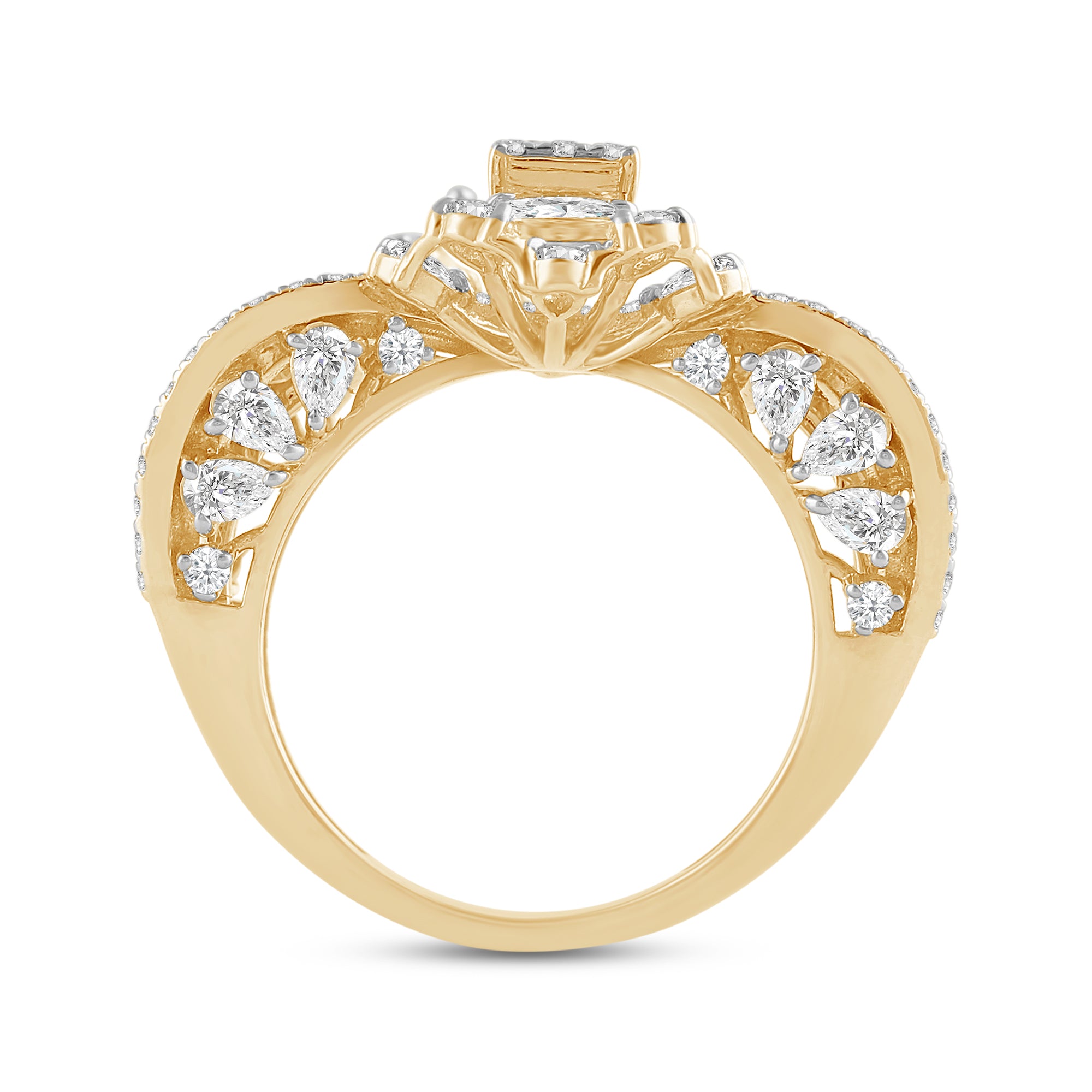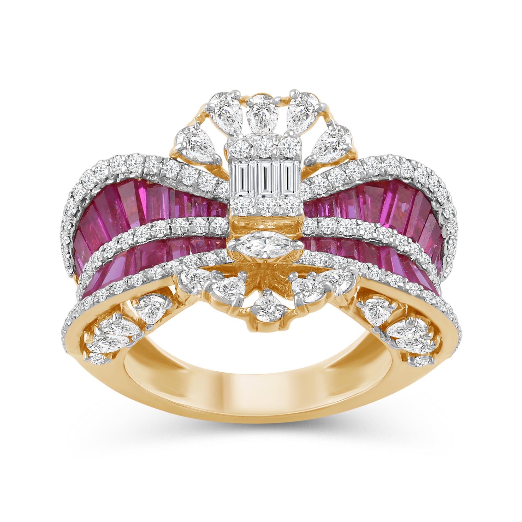 A series of baguette diamonds set in a square commands attention at the center of the Regalina Esperia Ring. Surrounding it, ribbons of baguette-cut rubies unfurl like velvet banners of a royal court. Together, they crown the piece with a tiara-like silhouette, a symbol of majesty and granduer.