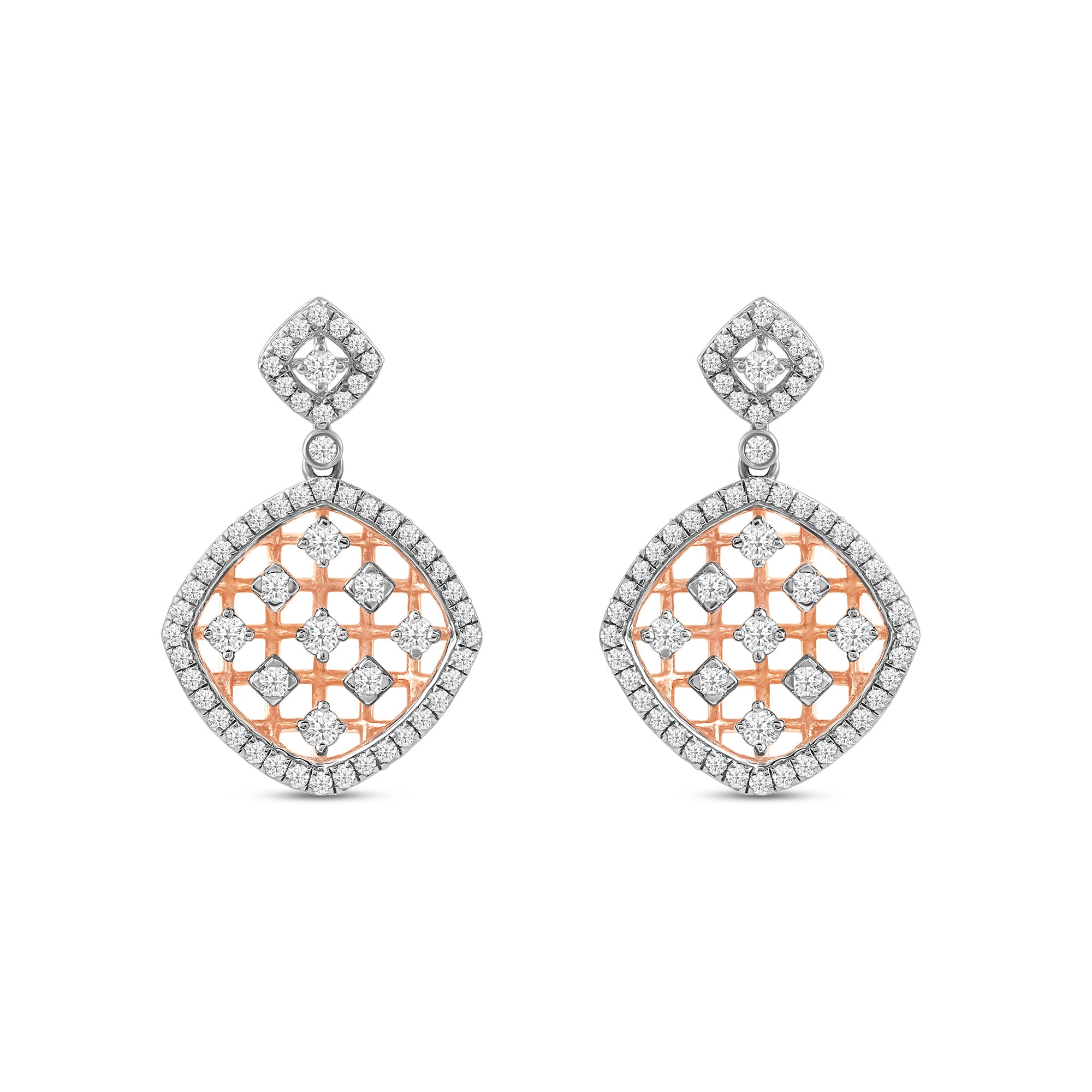The Rose Lace Leora Earrings feature a delicate silhouette. The open filigree structure makes them feel weightless, and the rose-gold encrusted diamond details speaks of intricate craftsmanship and grace.