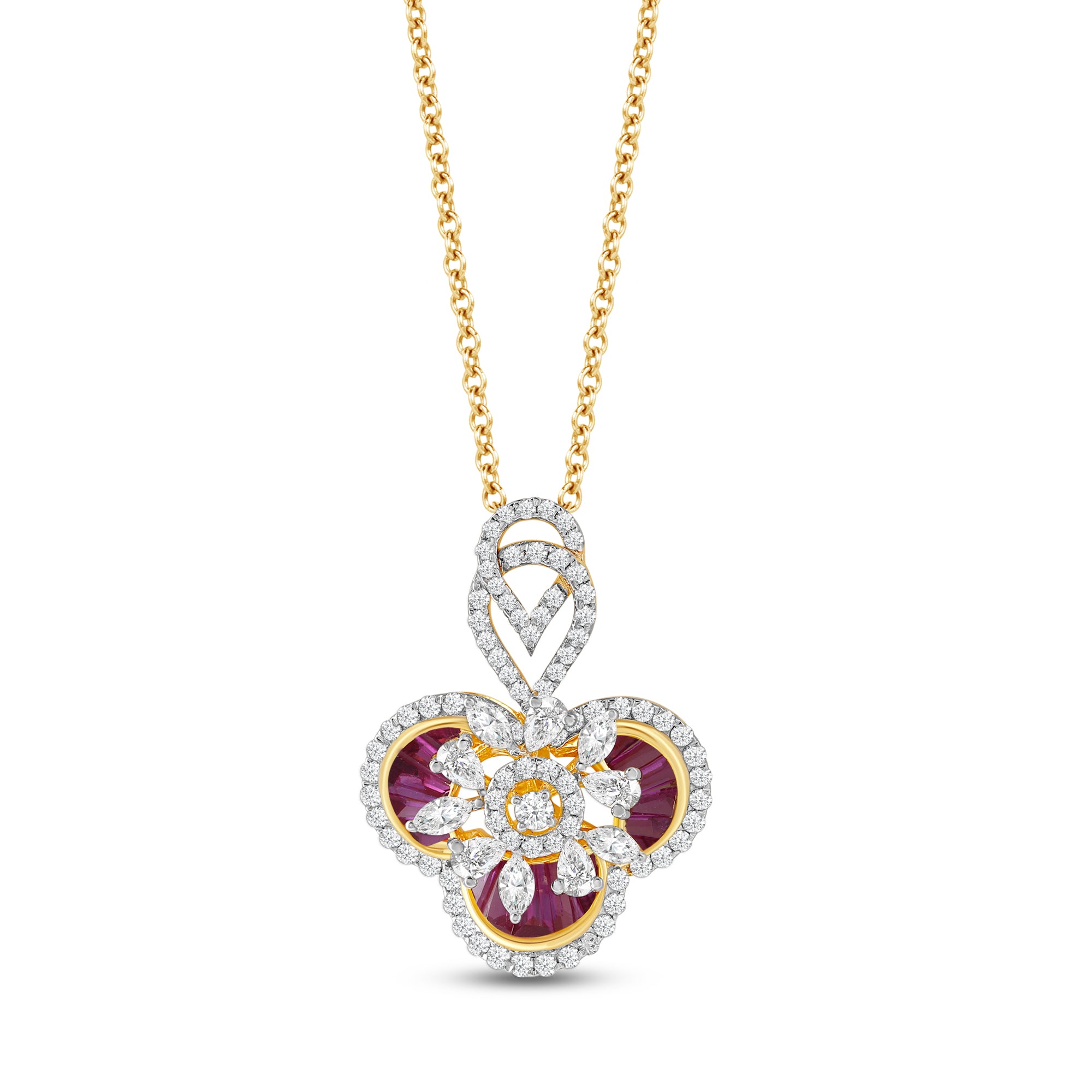 The Scarlet Fleur Esperia Necklace can bring a bold pop of colour to any look. With glowing rubies and sparkling diamonds set in warm gold, it’s designed to turn heads. Its sculpted curves make it perfect for days when you want your jewellery to be anything but subtle.