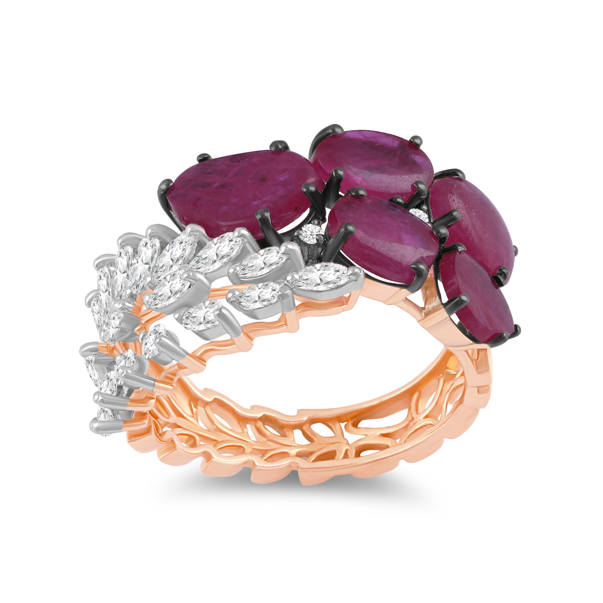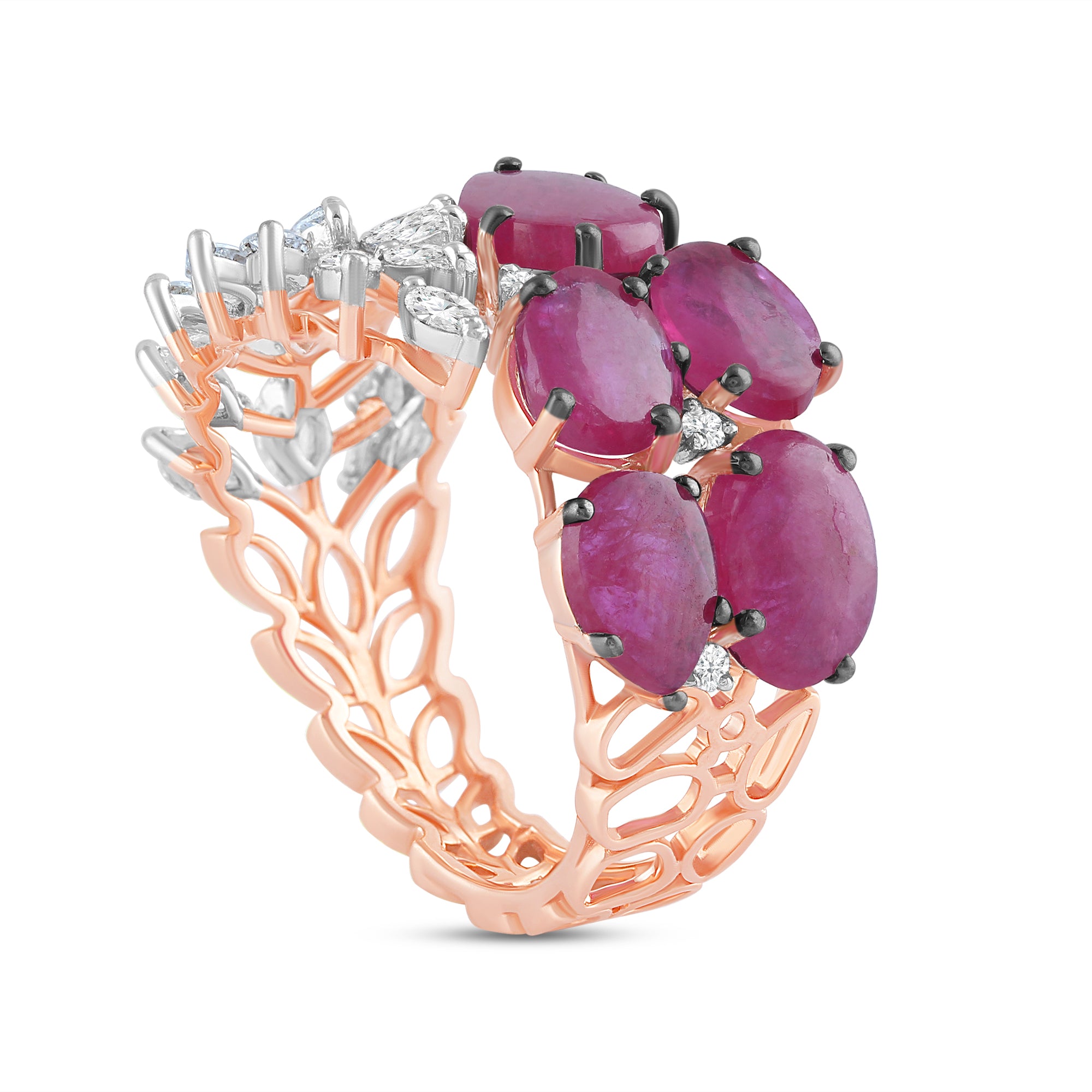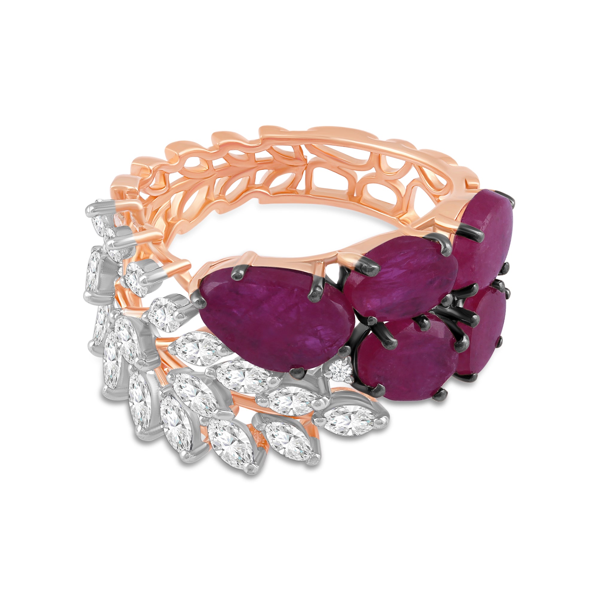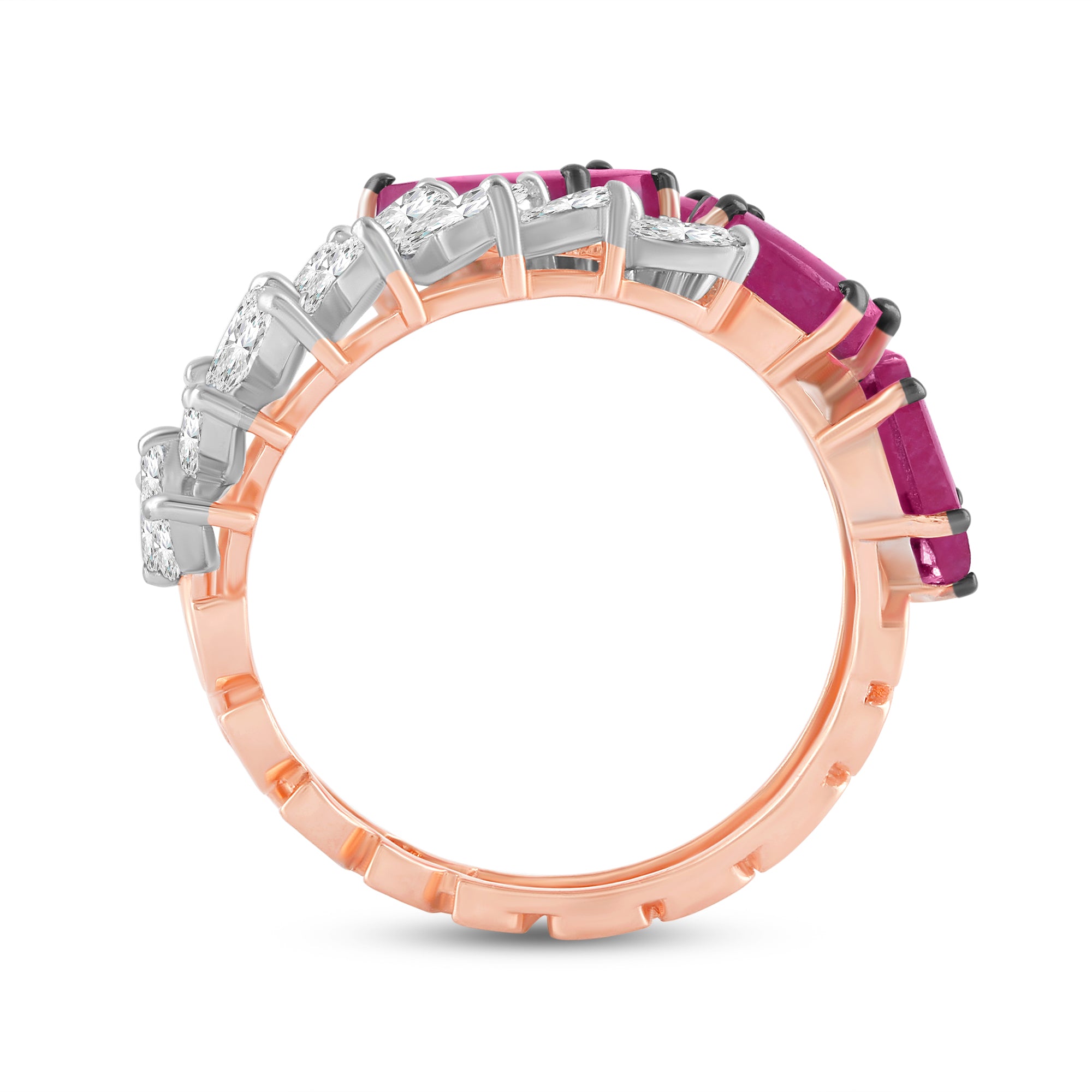 Designed to stand out, the Scarletta Fire Ring pairs flat-cut oval rubies with pear-cut diamonds for a sharp, modern silhouette. Its dramatic composition radiates timeless opulence.