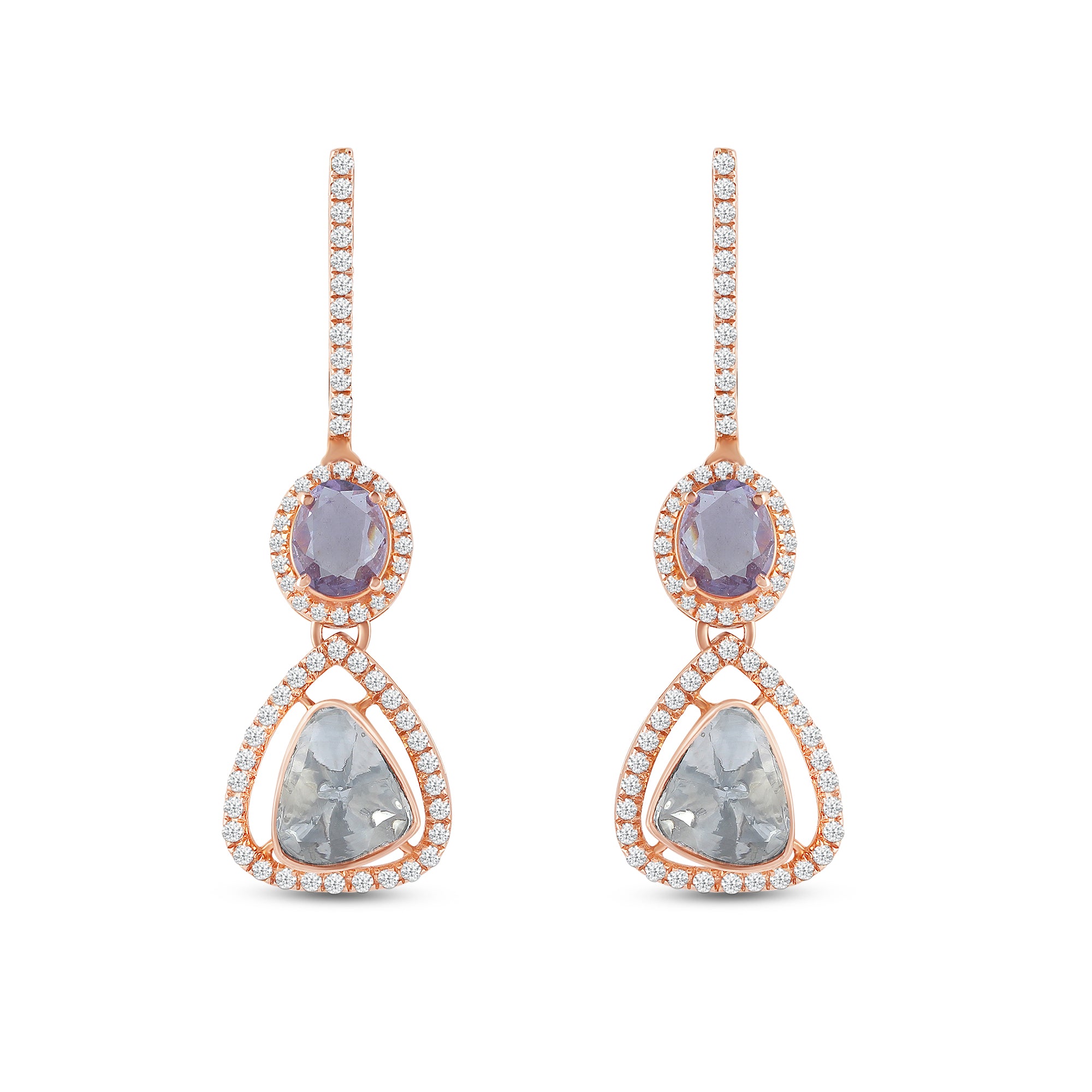 The Soreira Amara earrings are a delicate ode to femininity. Suspended from a trail of pavé-set diamonds, a blush-toned sapphire rests above a luminous trillion-cut polki diamond, encircled in light—capturing the quiet beauty of dawn in gemstone form.